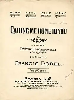 "Calling Me Home To You" is an American song written by Edward Teschemacher and composed by Francis Dorel.[1] The song was first recorded on May 31, 1916, by Alfred De Manby, a baritone vocalist, for Columbia Records.[2]