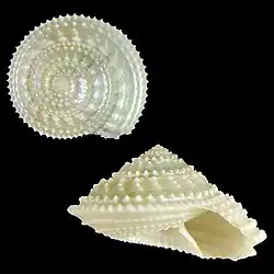 The size of the shell varies between 6mm and 10mm. It has a noticeable umbilicus and a luminous shell. It has spiral rows with tubercles.