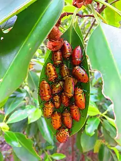 While the adults of this gregarious species may be found in large numbers on the leaves of any of its host species, the eggs are deposited only on the leaves of Excoecaria agallocha (commonly known as the "river poison tree", "blind-your-eye mangrove", "milky mangrove", or "buta-buta tree"), as the nymphs feed only on the seeds of this plant.[6][8]