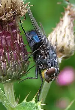 Calliphora vomitoria, known as the blue bottle fly,[3] orange-bearded blue bottle,[4] or bottlebee, is a species of blow fly, a species in the family Calliphoridae. Calliphora vomitoria is the type species of the genus Calliphora. It is common throughout many continents including Europe, Americas, and Africa. They are fairly large flies, nearly twice the size of the housefly, with a metallic blue abdomen and long orange setae on the gena.