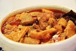 Callos a la Madrileña is a stewed tripe dish, cooked slowly for hours over low heat, that is a speciality of Spanish cuisine associated with the city of Madrid. Traditionally pig or cow tripe was used but modern recipes use lamb or even cod. It includes pig snout and trotters, black pudding, sausage, ham, and soup vegetables like carrots and onions.[1] When prepared correctly the broth is rich in gelatin and the tripe becomes very tender after the slow cooking process. The tripe can be browned before the cooking liquid is added, with trotters, oxtails and other ingredients for the soup like ham, chorizo and smoked paprika.[2] It is common to serve this stew with the morcilla blood sausage, a tapas dish typical of the region of Castile and León.[3]