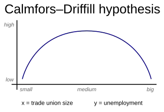 The Calmfors–Driffill hypothesis is a macroeconomic theory in labour economics that states that there is a direct relationship between the degree of collective bargaining in an economy and the level of unemployment. Specifically, it states that the relationship is roughly that of an 'inverted U': as trade union size increases from nil, unemployment increases, and then falls as unions begin to exercise monopoly power. It was advanced by Lars Calmfors and John Driffill.[1]