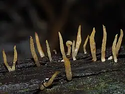 Calocera cornea is a jelly fungus that grows on decaying wood.[1] It is a member of the Dacrymycetales, an order of fungi characterized by their unique "tuning fork" basidia.