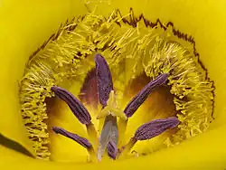 Atop the stem is a lily bloom with sepals up to 4 centimeters long. The petals are up to 5 centimeters long and yellow with a darker line or series of bands near the base, which are often red. The cup of the flower is filled with hairs which have clubbed ends. The anthers are often deep purple.[2]