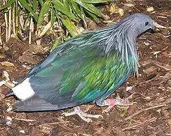 The genus Caloenas was introduced by the English zoologist George Robert Gray in 1840 to accommodate the Nicobar pigeon.[1][2] The genus name combines the Ancient Greek kalos meaning "beautiful" with oinas meaning "dove".[3]