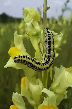 The female lays anywhere from 30 to 80 eggs on the leaves and flowers of toadflax plants. In one to two weeks the larva emerges from the egg and begins feeding. This caterpillar undergoes five molts during a one-month period. The first-stage larva is about 5 millimeters long and dark gray in color. The eyecatching older larvae are black and white spotted with bright yellow stripes. The mature larva is about 4 centimeters long. After this stage it pupates through the winter in a cocoon of chewed plant matter and leaf litter.