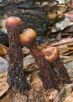 2006 First studied by Brazilian mycologist Johann Rick, the species was published posthumously, 15 years after his death in 1946.[54] Initially named Myremyces zanchianus, only a single specimen is known.[55] The species has an egg-shaped head, 1.3 cm (0.5 in) long by 1 cm (0.4 in) wide, atop a stalk. The "mouth" is star-shaped and made of 4 long slits that open at maturity. The spores are 30–35 by 15–20 μm, spindle-shaped to elliptical, smooth, and have a prominent longitudinal groove.[55]