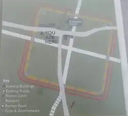 Archaeological excavations and geophysical surveys on Church Hill, conducted between 2007 and 2011 by archaeologists from the University of Exeter, revealed evidences of a settled population in the Early Bronze Age (c. 2200-2000 BCE). During the Late Iron Age (500-350 BCE), the church hill was surrounded by an enclosure. It is possible that the Romans reused this Iron Age hill fort when they set up their own, albeit smaller, squared Roman fort measuring about 170 m × 160 m (560 ft × 520 ft). This fort, discovered during the same excavation, is only the third known in Cornwall, and the largest. [8][9] The fort was likely established in about 50/55 CE, contemporaneously with a legionary fortress at Exeter. It is thought that up to 500 soldiers would have been based here. More recent excavations have revealed the presence of a Roman mine consisting of pits connected by a network of tunnels. There is also evidence of a Roman road in the vicinity.[10] The fort was occupied for about thirty years: in 75 CE, the Legio II Augusta moved on to South Wales, leaving auxiliary units behind in Devon and Cornwall. The site was probably abandoned around 80/85 CE, buildings were disassembled and demolished and the ramparts and ditches leveled. Only from the 8th century CE onwards, was the hill again populated. Part of the Roman site is now occupied by St Andrew's Church and the cemeteries; an interpretation board at the entrance to the cemetery opposite the church gives more details.