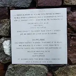 Several years after its completion, the road was finally adopted and surfaced by the local council. By then, Calum and his wife, Lexie, were the last inhabitants of Arnish.[1] Today it is commonly referred to as Calum's Road.[2][3][4]