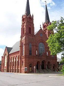 St. Paul the Apostle Church, formerly known as St. Joseph's Catholic Church, was formed in 1889 by Slovenian immigrants who came to the Calumet area to work in the booming copper mines. The first church that they built burnt down in 1902, but the church was rebuilt in sandstone by 1908.[22][23] The church "rises authoritatively over the village like a cathedral of medieval Europe."[24]: 476 When the church was completed, the cost of construction was an amazing $100,000. It is constructed of local Jacobsville sandstone, and features beautiful stained glass windows, a custom-built 19’ by 18’ pipe organ, and a beautifully painted interior. The interior of the church remains virtually unchanged architecturally.[25] In 1966, four of the five Catholic churches in the Calumet area were forced to merge because of the low number of parishioners and economic constraints. This included St. Anne's (the French church), St. John's (the Croatian church), St. Mary's (the Italian church), and St. Joseph's. The combined parish is housed in the old St. Joseph's building, and has changed its name to St. Paul the Apostle Church.[26] Today, they have a large and active congregation, which pays for the upkeep of the church.[27]