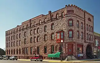 The Calumet Hotel, also known as the Calumet Inn, anchors the historic district of downtown Pipestone, Minnesota, United States. The three-story Richardsonian Romanesque hotel was built with light pink jasper quartzite as opposed to the red Sioux quartzite used in most other downtown buildings. The present hotel was built to replace a previous hotel, also three-stories, which was destroyed in an 1886 fire.[2]