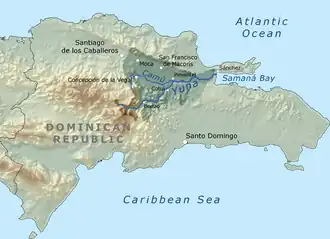 The Camú River (Spanish: Río Camú ) is 141.83 km (88.13 mi)[1] long river located in the northern Dominican Republic. It rises in Cordillera Central, flowing first north and then east past the city of Concepción de la Vega before reaching its mouth at the Yuna River near the city of Pimentel at the Duarte and Sánchez Ramírez province line.[2][3]