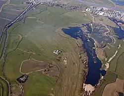 Camber Castle now lies on the Brede Level, a wide, reclaimed area of land between the modern towns of Rye and Winchelsea, about 1.5 kilometres (0.93 mi) from the sea.[73] The surrounding pasture land is flat and only just above sea level, marked with numerous ridges formed by the retreating coastline over the centuries.[74] On the eastern side of the fortification is Castle Water, a large, 20th-century gravel pit that is now flooded to form a wetland nature reserve.[75]