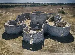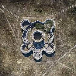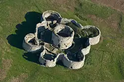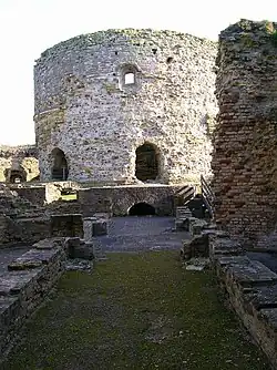 An underground vaulted ring passageway, only 1.9 metres (6 ft 3 in) high ran around the outside of the keep, with similar covered radial passageways leading off to each of the bastions; the passageways are now ruined.[89] A cobbled courtyard surrounded the keep, separating it from the external defences, and containing a well in the north-west corner.[90] Underground passageways led from the entrance bastion to outside the castle walls, either to allow the garrison to escape in an emergency or to assault a besieging force.[91]