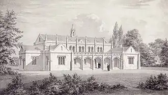 The Collegiate School was situated on a two-acre site laid out as a pleasure ground and flower gardens,[5] and housed in a purpose-built building constructed the previous year to the designs of Henry Roberts, who had also designed the Fishmongers' Hall.[3] Built at a cost of about £3,600[2] in white brick with stone dressings,[1] and incorporating some aspects of Tudor style,[3] it had a frontage of 300 feet,[1] and was notable for the cloister which formed the centre of its entrance front.[5]
