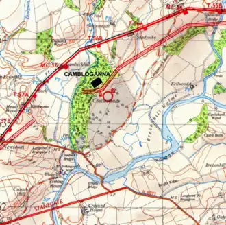 Camboglanna (with the modern name of Castlesteads) was a Roman fort. It was the twelfth fort on Hadrian's Wall counting from the east, between Banna (Birdoswald) almost 7 miles (11 km) to the east and Uxelodunum (Stanwix), 9 miles to the west.[1] It was on a high bluff commanding the Cambeck Valley.[2] It guarded an important approach to the Wall and also watched the east bank of the Cambeck against raiders from the Bewcastle area. The site was drastically levelled in 1791 when the gardens of Castlesteads House were laid over it. The name "Camboglanna" is believed to mean "Crook Bank", or "Bent Valley" because it overlooks a bend in the river Irthing; the name is Brythonic, made of cambo- "curved, bent, crooked" and glanna "steep bank, stream/river side, valley with a stream".