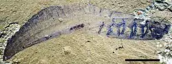Pikaia gracilens was the first Cambrian chordate known. It was discovered by Charles Doolittle Walcott from the Burgess Shale in the mountains of British Columbia, Canada. Walcott reported the specimen with taxonomic description in 1911. He used the series of transverse body segments as a feature of annelid worms and classified it as a polychaete worm.[1] He gave the name after Pika Peak, a mountain in Alberta, Canada. However, he was also aware of the unique differences from living worms that he prudently remarked: "I am unable to place it within any of the families of the Polychaeta, owing to the absence of parapodia [paired protrusions on the sides of polychaete worms] on the body segments back of the fifth."[8]