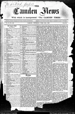 - ^ "Camden News". State Library of New South Wales catalogue. State Library of New South Wales. 27 November 2014. Retrieved 27 November 2014.