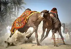 Due to the motivating factor of a nearby female camel, the events have historically been held during mating season.[3] The camels fight by using their necks as leverage to force their opponent to fall down. A camel is declared the winner if his competitor falls to the ground or flees from the fight.[6] Most fighting camels are bred in Iran or Afghanistan.[3][1] A successful camel can be sold for over $20,000.[6]