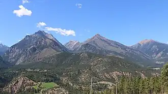 There have been copper prospects operating on Red Mountain 2445 m (8022 ft), the highest in the range, and on Poison Mountain 2264 m (7428 ft), just south Red, is located where the spine of the Shulaps Range intersects with that of the Camelsfoot, at the apex of the Yalakom valley which runs SE towards Lillooet from this point. Poison Mountain's name comes from the toxic leaching of its orebodies into local streams (and rumours of mercury in the copper ore) while Red's comes from the colour of its cuprous earth. Red's flanks show ziggurat-like scars that are evidence of the scale of ore-sampling that at one time was underway.