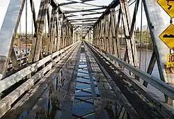 The second Cameron Street Bridge, a single-lane wooden Howe truss bridge, was built in 1931. Traffic was directed over the single-lane structure by means of traffic signals located at both ends of the bridge. The second bridge was closed in September 2005 due to structural problems. Due to the bridge's unique design, various ideas about saving the structure were considered (such as conversion to a pedestrian-only bridge). Eventually, the decision was made to demolish the old bridge and replace it with the current modern structure. However, the city decided to preserve the bridge's history by building a replica Howe truss bridge (with informative signage) carrying foot traffic nearby in Cottonwood Island Park.[2]