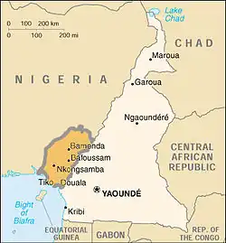 Although there is a long history of Cameroon–Nigeria boundary disputes, the most important has been the dispute over the sovereignty of the Bakassi peninsula, at the southernmost end of the Cameroon–Nigeria border.[20] The peninsula, located in the Gulf of Guinea between the Rio del Rey and Cross River State, was strategically important to both countries, both for its access to the port of Calabar – which housed the Eastern Command of the Nigerian Navy, as well as Nigeria's Export-Processing Zone – and for its oil resources.[21] Its population largely comprises fishermen of Nigerian citizenship.[22] In 1913, the so-called Ango-German Agreement, signed in London, had acknowledged that Bakassi belonged to the German protectorate of Cameroon. After the First World War, a Franco-British declaration in July 1919 placed it under the British Southern Cameroons, and it was therefore reunified with Cameroon after independence – an outcome which 59.5% of residents had supported in the 1961 referendum.[23]