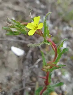 This is an annual herb producing a hairy stem up to about half a meter long which may be erect and unbranched or spreading along the ground and branching. The leaves are arranged in a basal rosette and are several centimeters long;[2] there are also leaves along the stem. The nodding inflorescence produces flowers with yellow petals a few millimeters long with one or two red spots at the bases. The fruit is coiled and one to two centimeters long.