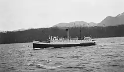When Prince Rupert was founded, in 1906, Camosun was the first passenger ship to call at the new port.[1] The harbor at Prince Rupert had not been fully surveyed, and in July 1906, Camosun struck a rock in the harbor.[1] The vessel would have sunk, but was saved by the double-bottom design.[1] As a result, service was disrupted by the need transfer Camosun to Victoria, British Columbia, where the vessel underwent repairs at Joseph Spratt's shipyard.[1]