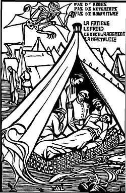 The huts were not built when the soldiers arrived. In consequence, they were housed in emergency tents. Bad weather and the recently ploughed land quickly created a quagmire in which it was difficult to move. A lack of instructors, equipment and supplies caused frustration. Disease caused significant mortality.