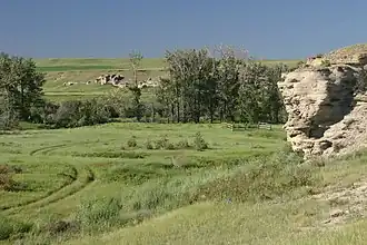 Camp Disappointment, 2005, view northeast from south bluff. Camp site marked by fenced-in historical marker. Cottonwood trees in background line the banks of Cut Bank Creek. The ledge to the right was an Indian buffalo jump. | |