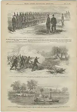 The recruits marched through Washington, D.C., on May 15 and they were trained and located on Mason's Island (now Theodore Roosevelt Island) on May 19. They were stationed on an island due to the degree of animus against African Americans generally, which was heightened due to a major influx of African Americans into the city. It was common to see racially motivated violence.[3] There were people in the District of Columbia who did not want to see African Americans bear arms. There was fear in the military leadership of the reaction if they were to march within the city.[4] For their protection, the men were secretly moved to the island, known at that time as Mason's Island.[3] President Lincoln did not know where they were and the white recruiting officers were prevented from coming onto the island. A detachment of Massachusetts troops were brought in to protect the recruits after they were attacked in June by a gang who found out where they were located.[3]
