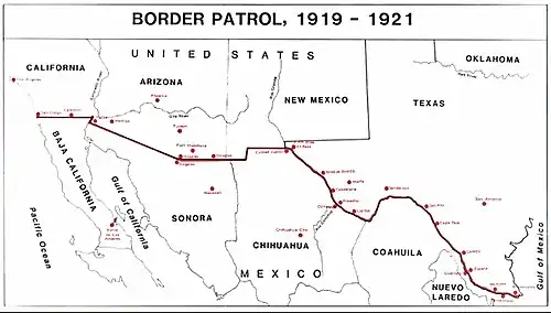 ![]() Map showing location of the U.S. Army southwestern border outposts, including Douglas, Arizona, the site of Camp Harry J. Jones. The main entrance was near what is today the intersection of West 10th Street and North Washington Avenue | |