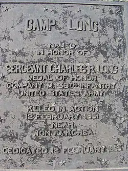 The U.S. Army Garrison Camp Long was a U.S. Army installation located near Wonju, South Korea. This camp was named in honor of Sergeant Charles R. Long of the U.S. Army, who received the Medal of Honor for his actions nearby in 1951 during the Korean War. Sergeant Long was acting as a forward observer in Company M of the 38th Infantry Regiment, 2nd Infantry Division when he was killed in action.