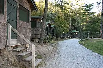 The cabins of Camp Merrie-Woode are rustic wooden structures with screened windows and electricity. A typical cabin consists of four to six campers of the same age and one or two counselors. These cabins share two modern bathhouses located directly behind the cabin line. Older campers live in larger cabins with eight to ten campers, two counselors, and built-in bathrooms.[3]