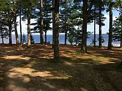 ![]() A wooded clearing next to O-AT-KA's main office building looking out on Lake Sebago | |