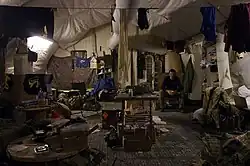 Camp Bastion's Hospital was built by 170 Engineer Group[29] and was operated by regular and reserve personnel of the British Army, Royal Navy, and Royal Air Force of the Joint Force Medical Group,[35] as well as medical assets from the US Army. Medical staff included orthopaedic surgeons, general surgeons, anaesthetists, nurses and medics. The hospital was the location to which wounded military personnel from the British, US and other ISAF forces in Helmand Province were evacuated from the battlefield for treatment, supported by US Army, Navy, and Air Force medics, or from which they were further evacuated to the Royal Centre for Defence Medicine at Queen Elizabeth Hospital in Birmingham. Afghan civilians were also treated at the hospital for injuries sustained in war including victims of improvised explosive device attacks.[45] The hospital was closed down on 22 September 2014.[46]