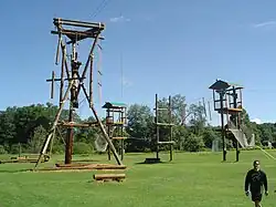 In addition to the camp’s science program, there were facilities for many other sports and activities. Camp Watonka had a large ropes course facility, designed and built by Alpine Towers International.[5] The 50' climbing wall (Carolina Straight Wall), built in 2001, had six faces with varying degrees of difficulty. The 50' tower (Alpine Tower II), built in 2001, had six routes to the top and various obstacles to tackle, including cargo nets and hanging logs. A swing was suspended between the tower and an adjacent support. Riders are attached to the swing, hoisted diagonally and then released to swing back and forth like a pendulum.
