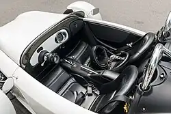 The passenger cabin accommodated two passengers with dedicated bucket seats, and, as in the case of the Campagna T-Rex model, a steering wheel and pedals closer to those of cars were used to control the vehicle using motorcycle components, and, in contrast, clocks provided by Harley-Davidson. The cockpit has been adapted to driving in the rain thanks to its water resistance.[2]