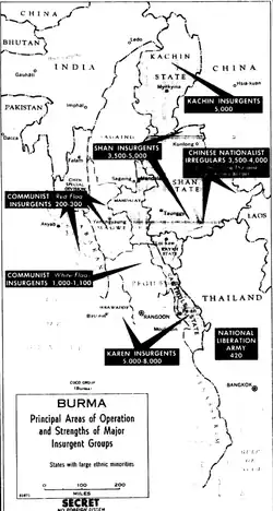 ![]() Burmese troops on the lookout for Kuomintang troops near the China–Burma border, c. April 1954. | |||||||