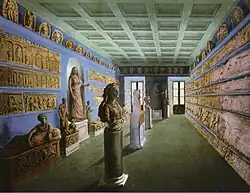 The Egyptian elements in many tiles are of particular interest, such as the cladding tiles held in the British Museum[19] and in the Museum August Kestner in Hannover, which include crude imitations of Egyptian hieroglyphs - rarely encountered in Roman art.[20] They are also of great interest for study of ancient buildings and art, such as the aforementioned Capitoline temple.[21]