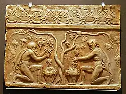 Even when it is known exactly where a relief tile was found, there is no absolute certainty because to this day no tiles have been found in the place of their original use. Scholars largely agree that the tiles served decorative and practical functions, although it is uncertain exactly which part of the building they were placed on.[11] Their origin in Etruscan-Italiote temple architecture is clear and certain, but it can nevertheless be assumed that temples were not the primary usage context at least in the tiles' later phases. On account of their consistently modest scale, the reliefs were more suitable for close viewing, which implies use on smaller buildings. Whereas their Etruscan and Italiote precursors served to cover wooden temple roofs and protect them from weathering, the Campana reliefs seem to have been used far more in secular contexts. There they lost their protective functions and became wall decorations. For a time both forms of use were found side by side on temples, until finally the Campana reliefs lost their older use. On account of their fragility, the bricks must have been replaced often - it is suggested that this would have occurred once every twenty-five years or so. At first they were replaced with copies of the previous decorative tiles, but later newer motifs were substituted also. Increasingly from the first century stone temples replaced earlier buildings in wood, and Campana reliefs were only used in restorations.[12]