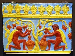The tiles were not individually made as unique artworks but as series. From an original relief (the punch) a mould in the shape of a negative was produced. Then the moist clay was pressed into these moulds. Probably the image and the framing decoration were formed separately, since framing decoration is seen which has been applied to various designs. After they had dried, the tiles were removed from the mould and possibly lightly reworked. Then they were fired. After firing and cooling, the terracotta was painted,[4] though sometimes the paint was applied before firing. Usually the reliefs received a coating, which acted as a surface for painting. This could be white paint or grey-yellow paint in Augustan times but it could also be stucco.