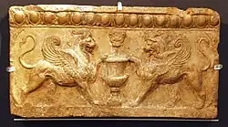 Nearly all Campana reliefs are from Central Italy, especially Latium. The largest and most important workshops seem to have been in Latium, especially in the neighbourhood of the city of Rome. Outside Latium the tiles are found mostly in Campania and in the former Etruscan sphere. At the end of the 1990s Marion Rauch compiled the reliefs with Dionysiac-Bacchic themes and was able to confirm this range for the motifs she was investigating. Nile scenes[6] are found only in Latium. No pieces have been found in the Greek areas of southern Italy or in Sicily.[7] An example from the Akademisches Kunstmuseum in Bonn, showing a Nike killing a bull was allegedly found in Agia Triada in Greece.[8] Some stuccoed examples derive from the western part of the Roman empire, the ancient regions of Hispania and Gaul (modern Spain and France).[9]