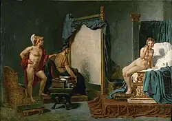 Campaspe's prose style is heavily "euphuistic," sharing significant commonalities with Lyly's famous novel Euphues (1578) in using antitheses, alliterations, repetitions, balanced clauses, and matching parts of speech. Like his Anatomy of Wit, the play is presented mainly as a series of dialogues, soliloquies, and alternating orations.[12] Notably, Apelles is a crucial figure in both works. Lyly expanded his use of dialogue for the play, using short, sharp exchanges for innovative comic and dramatic effect, as shown by this extract from Act 3 Scene 1, where Alexander the Great visits Apelles' studio to check on his progress in painting Campaspe's portrait, and begins to question him about the art of painting:
