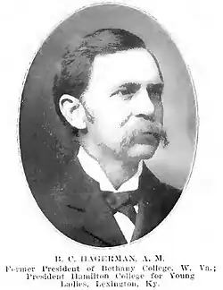 Barton Campbell Hagerman was from Shelby County, Kentucky and graduated from the Bible College of Kentucky University (now Transylvania University) in June 1874. He then attended Bethany College in West Virginia, graduating in 1876. He stayed there to teach Greek, and he married a Bethany College graduate Mamie Campbell on 11 September 1883.[2] They had two children while living in Bethany, one of whom lived to adulthood: Mary Virginia Hagerman Watson. After attending Hamilton College and then Campbell–Hagerman College, in December 1906, she married a distant relative Dr. Halford Adams Watson of Chicago - also a descendant of Thomas Campbell.[3]