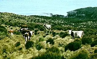 Cattle were introduced to Campbell Island in 1902, along with sheep and other livestock, as part of an ill-fated attempt to establish farming there. It was reported that, by 1910, there were ten cows and six bulls present, which were allowed to run wild. In 1931 the farming attempt had failed and the cattle were abandoned. A small herd of about 20 animals persisted until the 1970s, after which a programme of eradicating introduced livestock was implemented, with the cattle being exterminated by about 1984.[1]