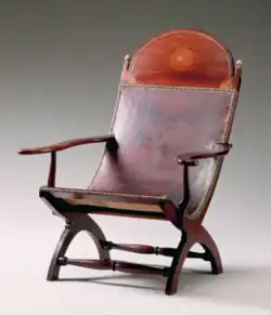 The majority of scholarship on the Campeche chair is by Metropolitan Museum of Art historian Cybèle Gontar, documenting hundreds of examples, considering associated terminology, bringing to light the popularity of what were called "Spanish" chairs throughout the New Republic, and showing that they were not limited to the American South. Gontar traces the form to the Iberian peninsula and indicates that, while the butaca is a "new chair for a new world," European precedents cannot be ignored.[2][3][4] Campeche chairs were originally upholstered in embossed leather or cane, though also came to be padded with fabric.