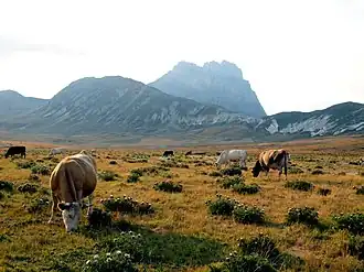 Campo Imperatore ("Emperor's Field") is a mountain grassland or alpine meadow formed by a high basin shaped plateau located above Gran Sasso massif, the largest plateau of Apennine ridge. Known as "Little Tibet", it is located in Gran Sasso e Monti della Laga National Park, near L'Aquila, Abruzzo, Italy.