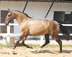 The height at the withers of the Campolina averages 158 cm (15.2 hands) for stallions and 152 cm (15.0 h) for mares.[6]: 3 A common view is that the most beautiful Campolinas are silver-grey, a position that may reflect a sentimental tradition for the first Campolina. Other popular colours for this breed include dun, bay, buckskin, and "Pampa" or pinto.[7] The appearance of markings such as white socks or a star on the forehead neither adds nor detracts to the horse in terms of official judging.