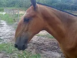 The head of the Campolina is described as trapezoidal in shape,[5] but the silhouette of this horse is smoothly rounded.[7] Between the ears, the poll is to be visible and raised by a few centimeters above the temples. The forehead is to be flat,[4] and the nasal bones apparent near the midpoint of the face in the rostro caudal plane. The head in profile is convex.[5] Campolinas are not, however, described to have a true Roman nose, as the convex profile begins approximately two finger widths below the base of the orbit. The muzzle should be soft and rounded, usually dark in colour, as are the hairs of the inner ear, mane and tail relative to the coat over the body. The nostrils are equal in size and should have a fine layer of flesh around the dorsal surface allowing for approximately one centimeter of separation between the thumb and pointer of the evaluator when the thumb is inserted into the nostril at a depth of around one inch. The outer edge of the nostril should be slightly thicker. The lips should be full and taut about the teeth. The ears are evenly placed when viewed from the front of the horse and not extend vertically more than three times the width of the eye when measured across the inner pinnae. The pinnae should close to a clean tip at the top of each ear. Eyes should be expressive.[7]